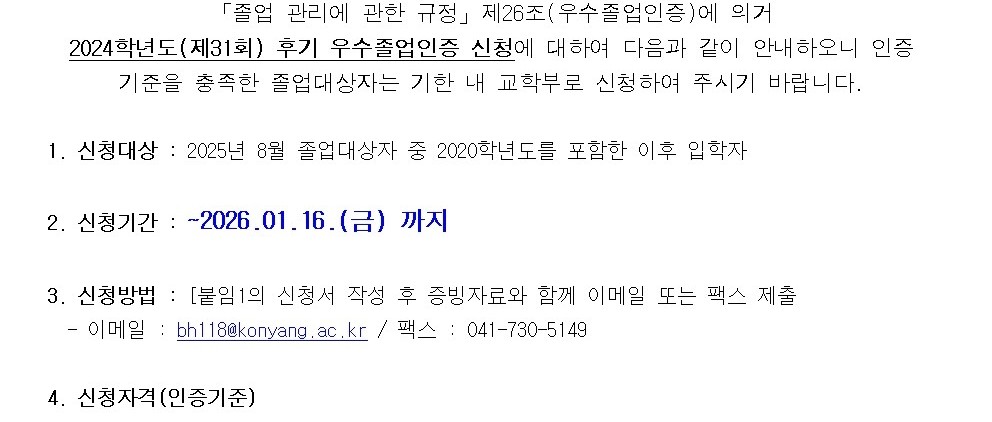 『 2025학년도(제32회) 전기 졸업대상자 우수졸업인증 신청 안내 』글의 상세내용을 확인하는 표로 제목, 부서명, 등록일, 조회, 첨부, 내용으로 나뉘어 설명합니다.